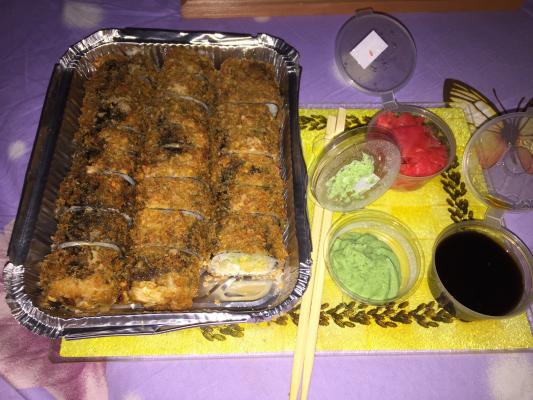 - В теплых ролла крайние кусочки отдаются запечатанными, так как большинству нравится дополнительная панировка на роллах!