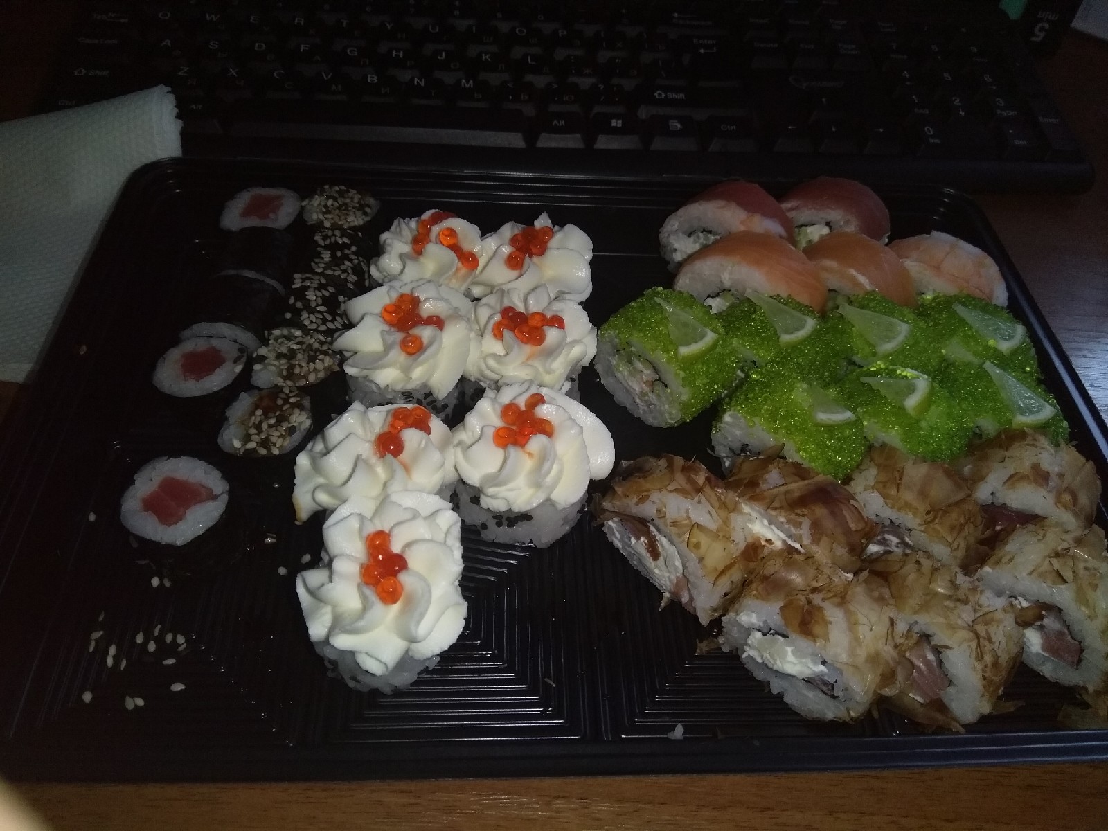 Все отлично: привезли вовремя, суши вкусные. Начинки много, рис приготовлен отлично.  А что ещё надо? Рекомендую однозначно))