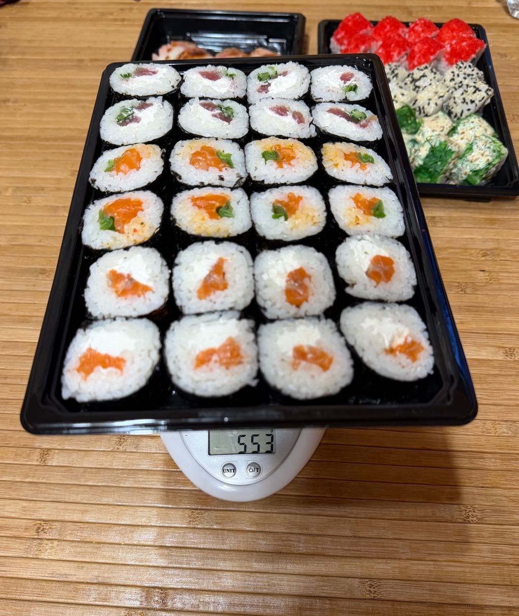 Сет "Большой куш" - отличный. Не взвешивал, но - рыба ( лосось, тунец) свежая, рис хороший, роллы не разваливаются. Только при заказе обращать внимание на цену, самая низкая цена только при самовывозе. В целом всё отлично. Спасибо.