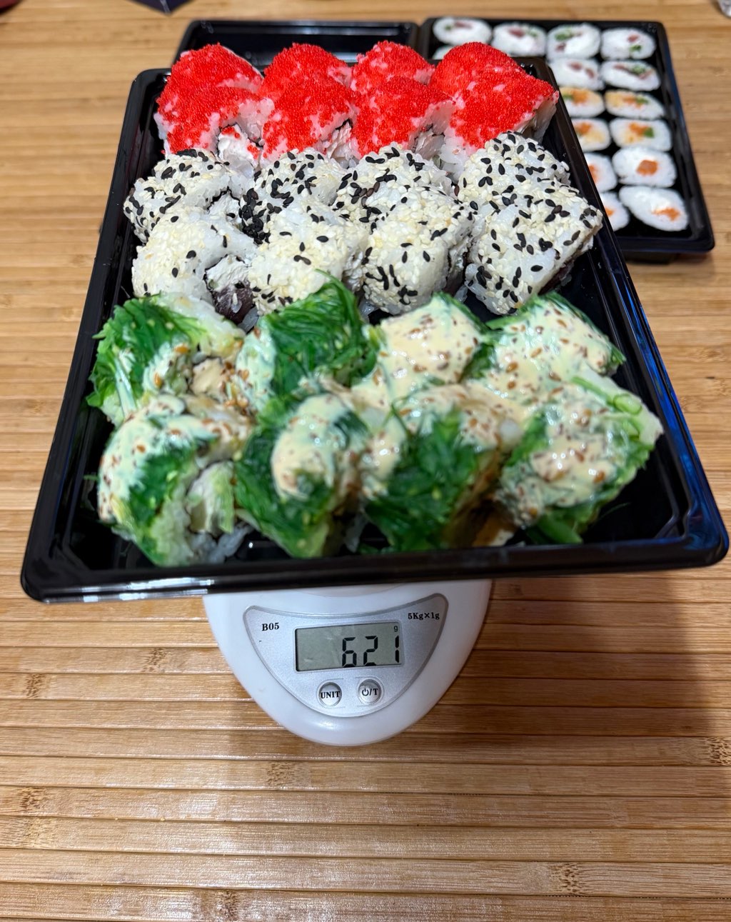 Но очень огорчил факт недовеса, вместо заявленных 1750 г , получилось все лишь 1568 , практически 1 набор суш не доложили (((