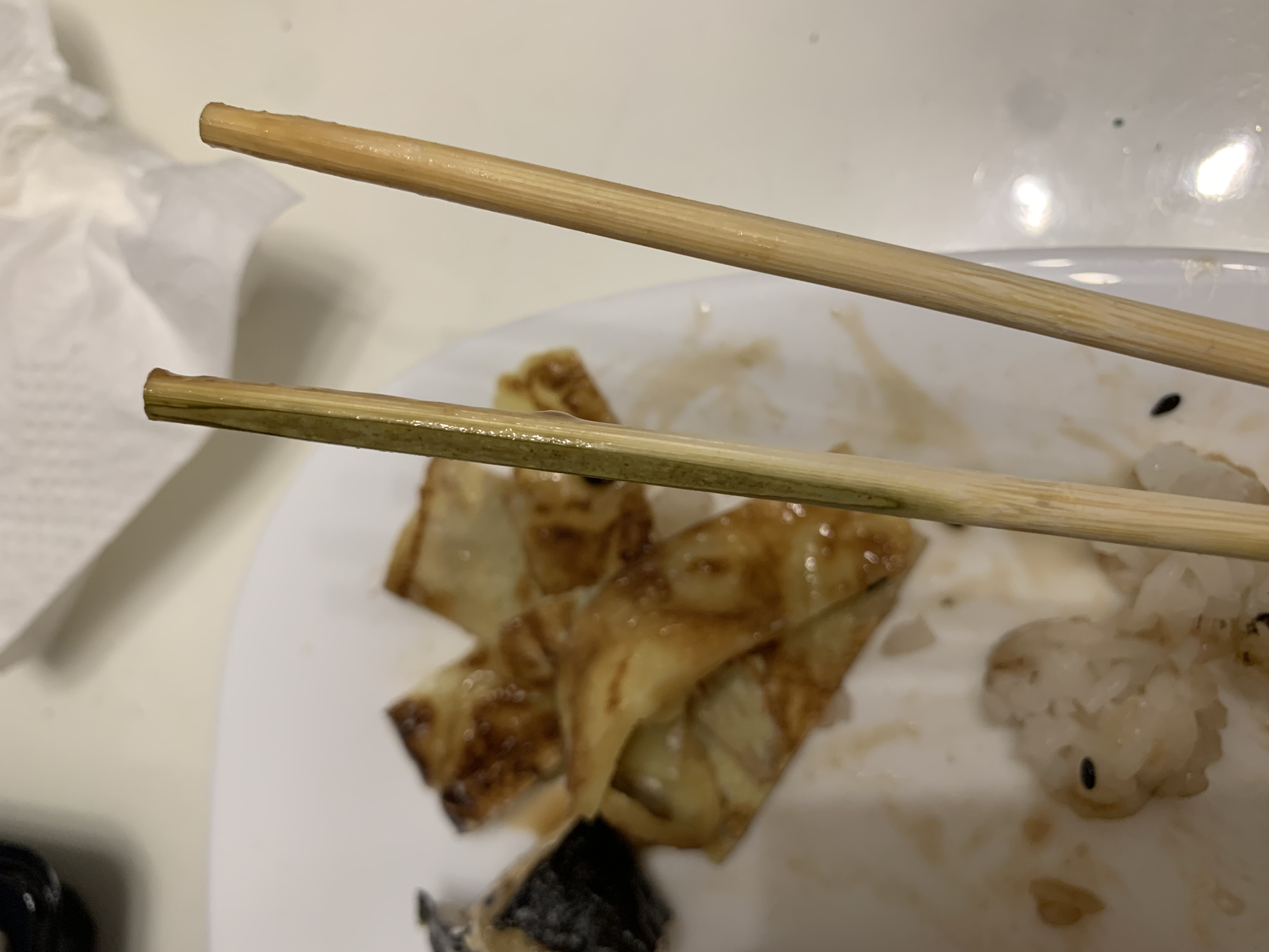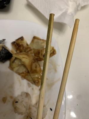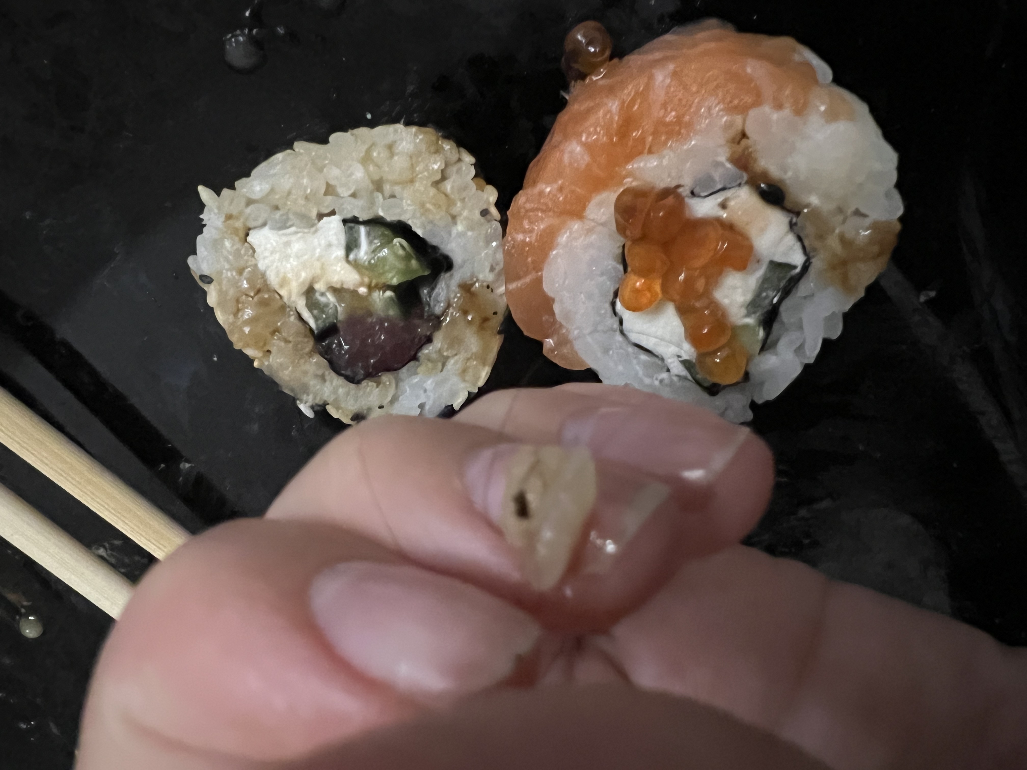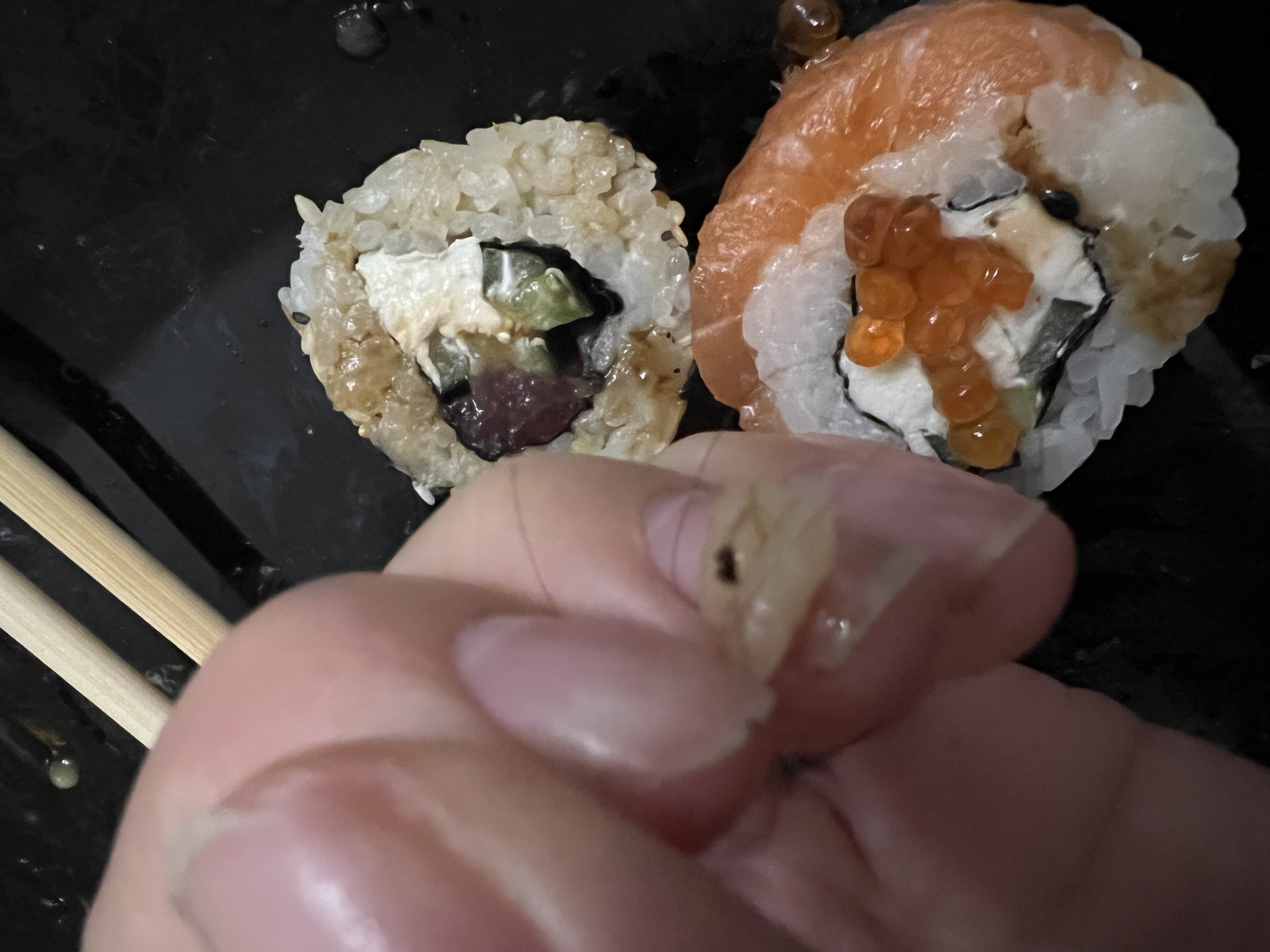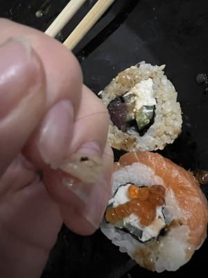 И ко всему в сушах попался сюрприз в виде женских волос , аппетит сразу пропал честно говоря ( и палочки , они ужасны , загнала занозу , теперь болит палец .