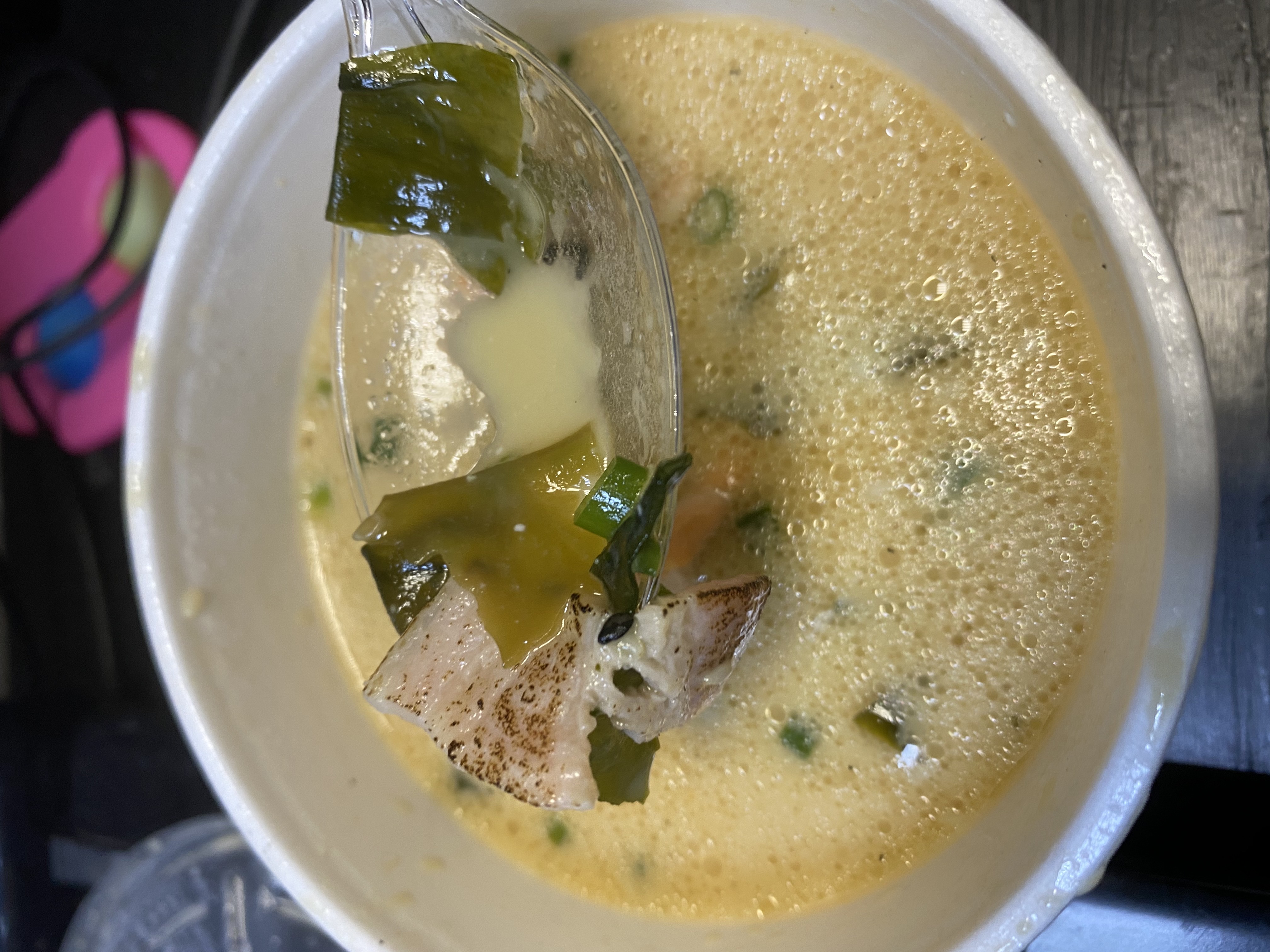 Добрый день !Заказыала суп сливочный с лососем и беконом !Мало того что бекона один кусочек ,так ещё вместо ложки палочки положили ,повезло что была своя !!!