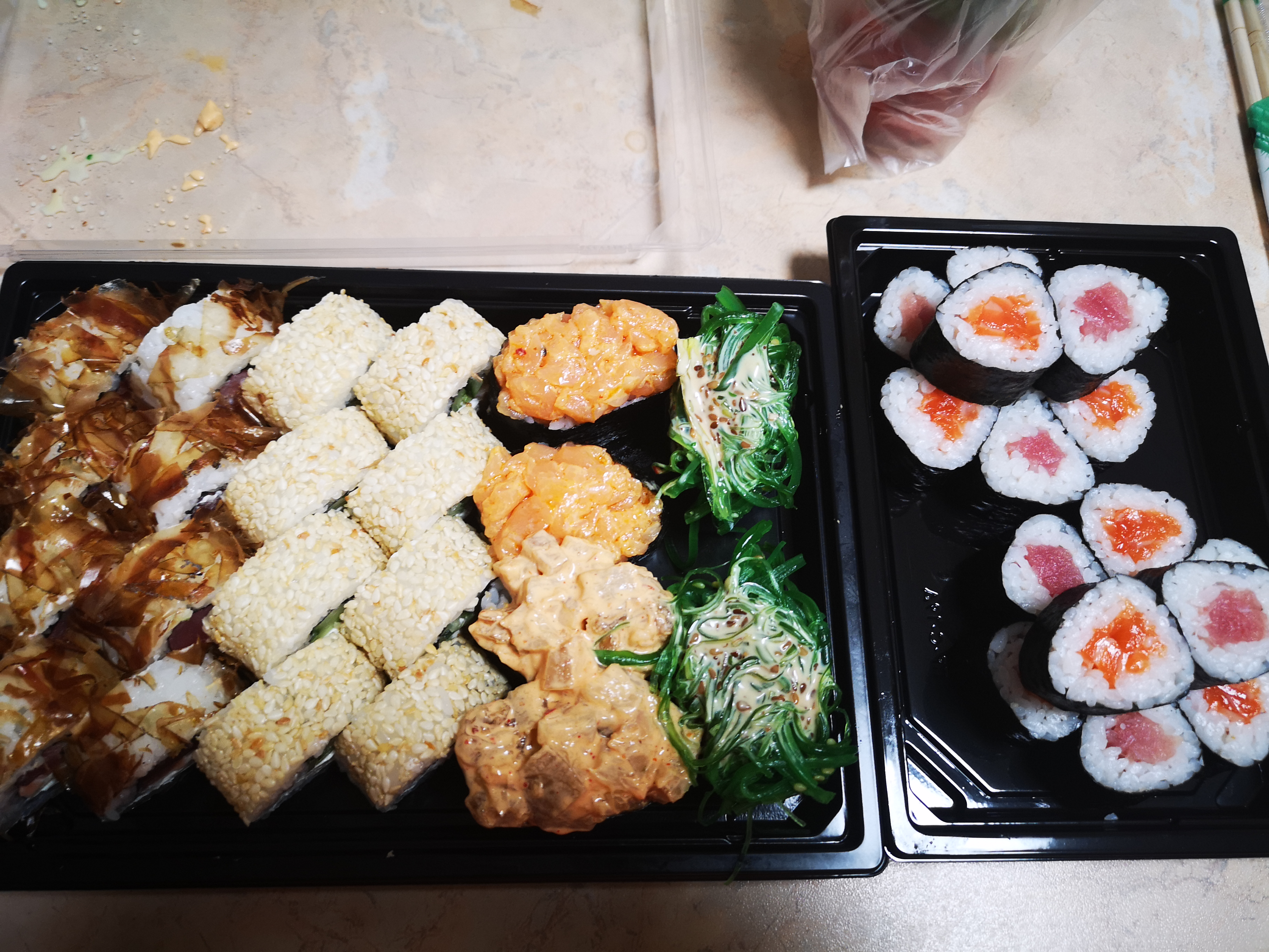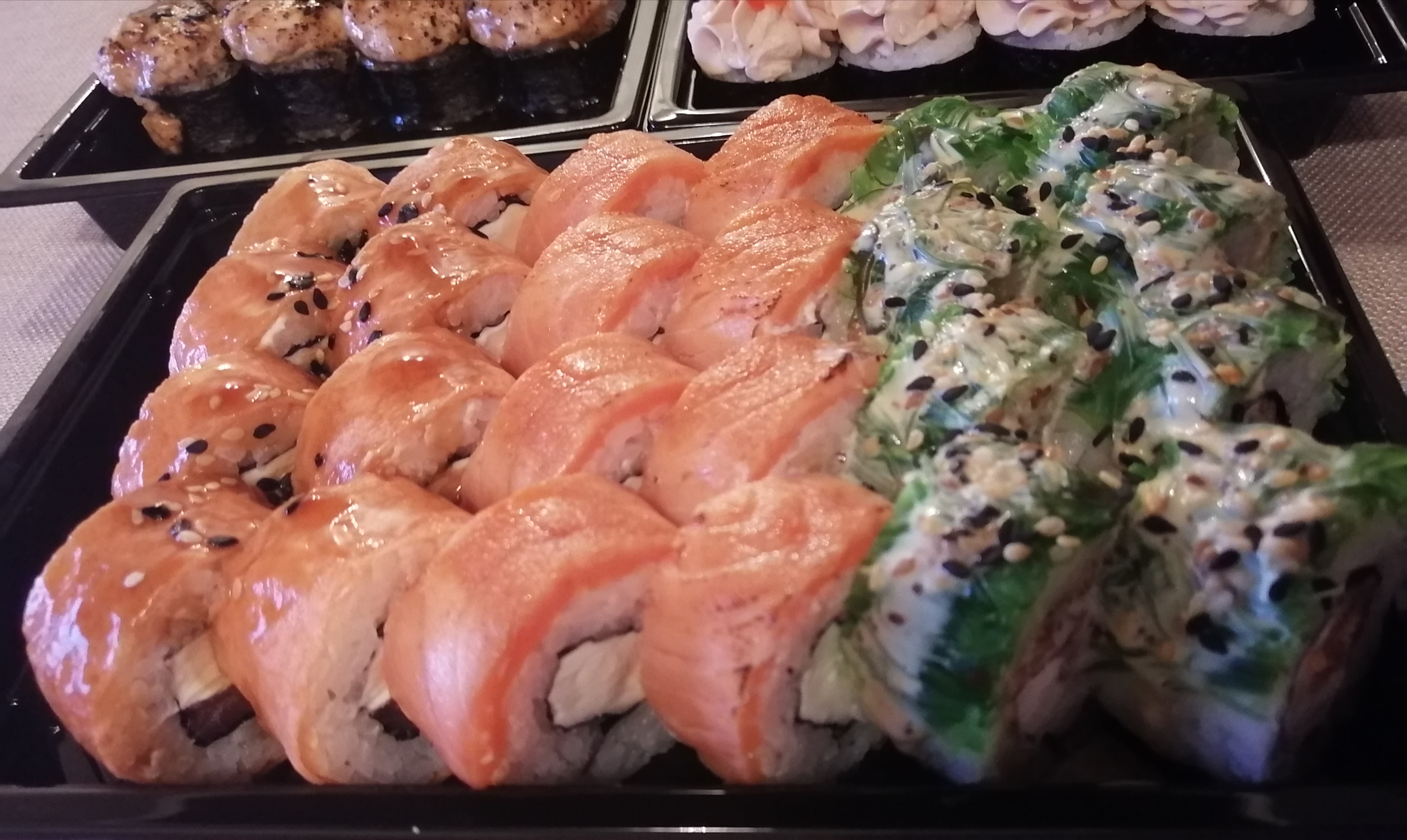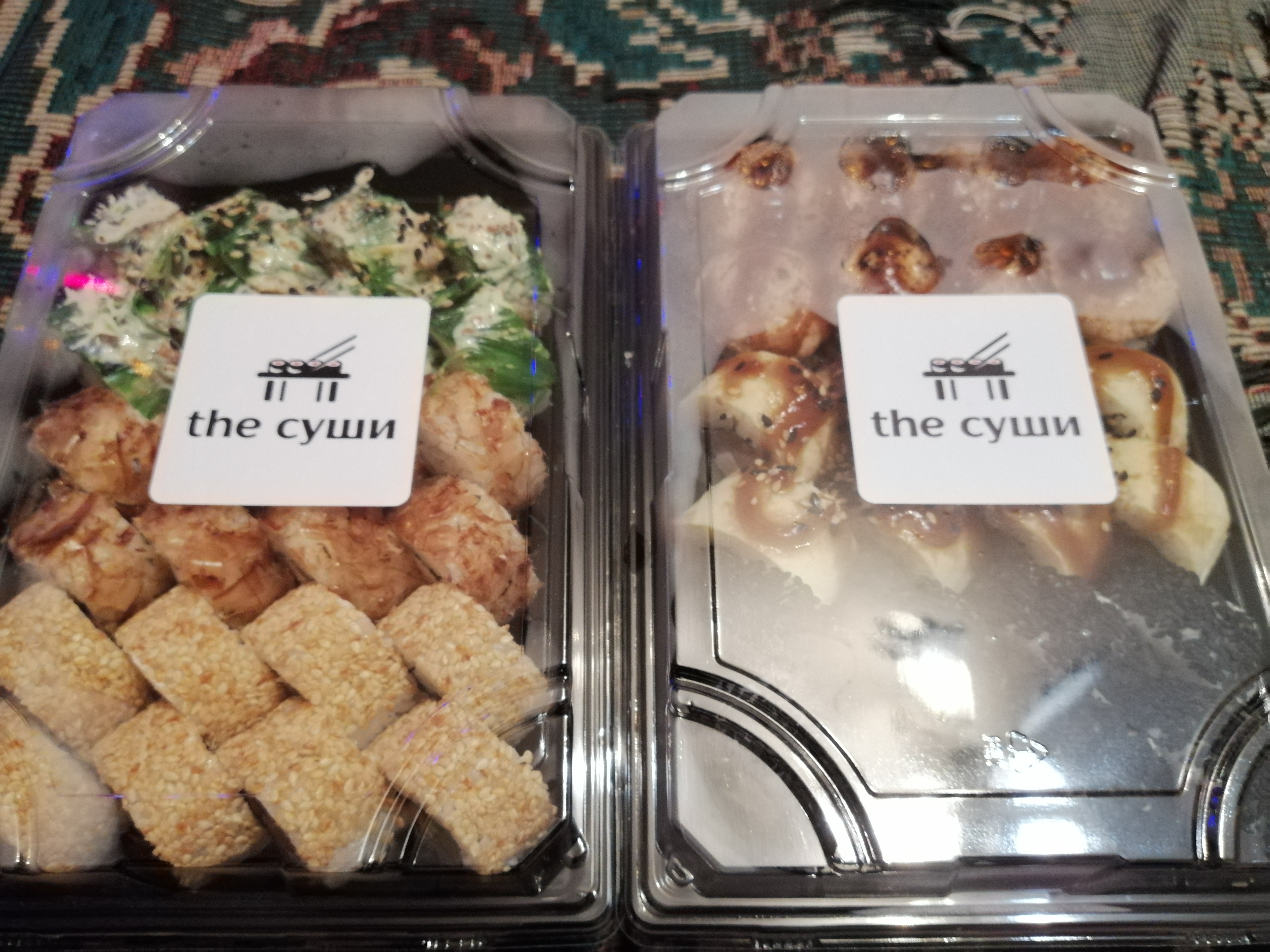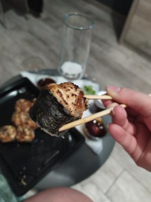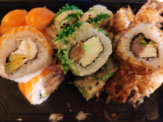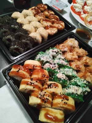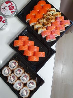 Всем доброго времени суток! Заказывали 03.01.20г. сет "2020" и по акции 2 по цене 1го роллы с опаленным лососем на самовывоз. Т. к. мы большие поклонники суши и являемся постоянными клиентами у другой компании, но вот решили попробовать что-то новенькое, (захотелось разнообразия в плане меню) . Делали заказ в данной компании впервые и полагались на преимущественное количество положительных отзывов. Приготовили очень быстро в течении 35 минут.Забрали мы их примерно через час.Персонал очень вежливый и внимательный. Суши свежие, имели презентабельный внешний вид, были скручены плотно и аккуратно .Количество рыбы скажем так было средненьким. Но МИНУС всё же был и это очень жёсткая ламинария. Она буквально не жевалась и была, как отдельный ингридиент, который изрядно испортил общее впечатление вкуса. Возможно просто нам так не повезло и действительно зависит от смены повара,но безусловно есть куда ещё расти данной компании.