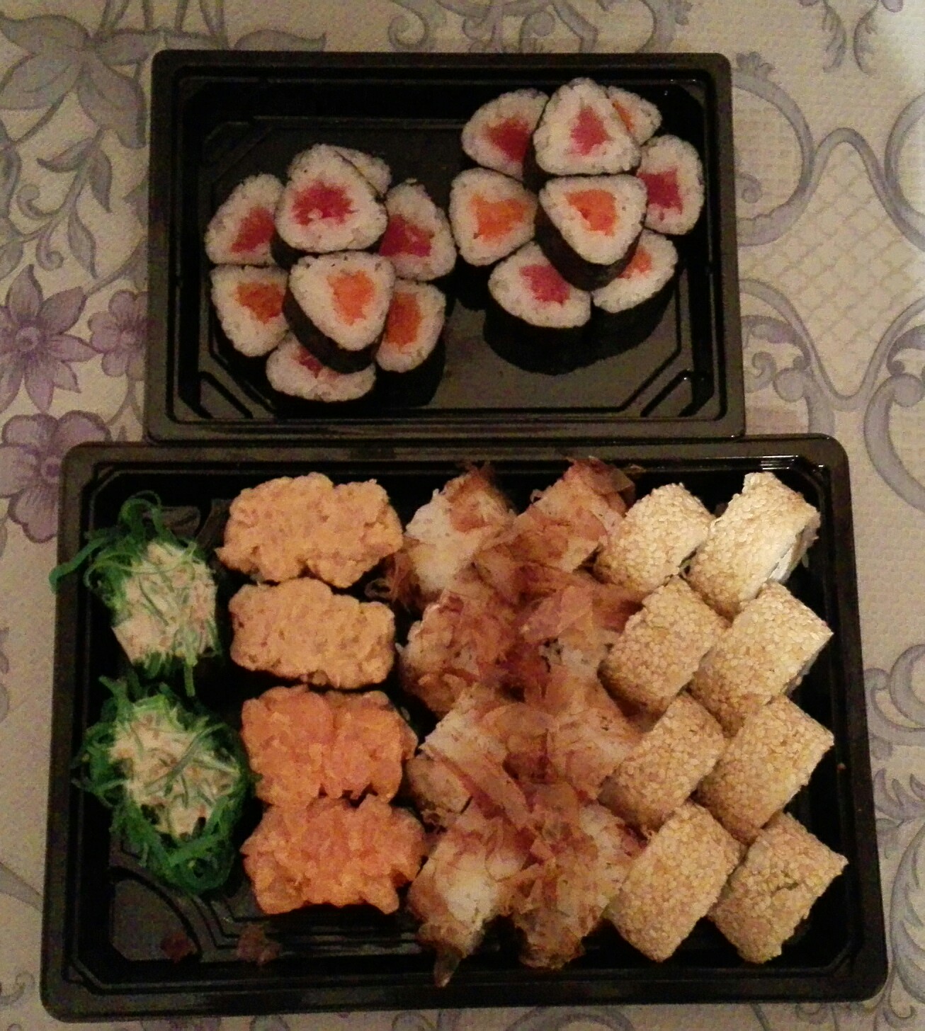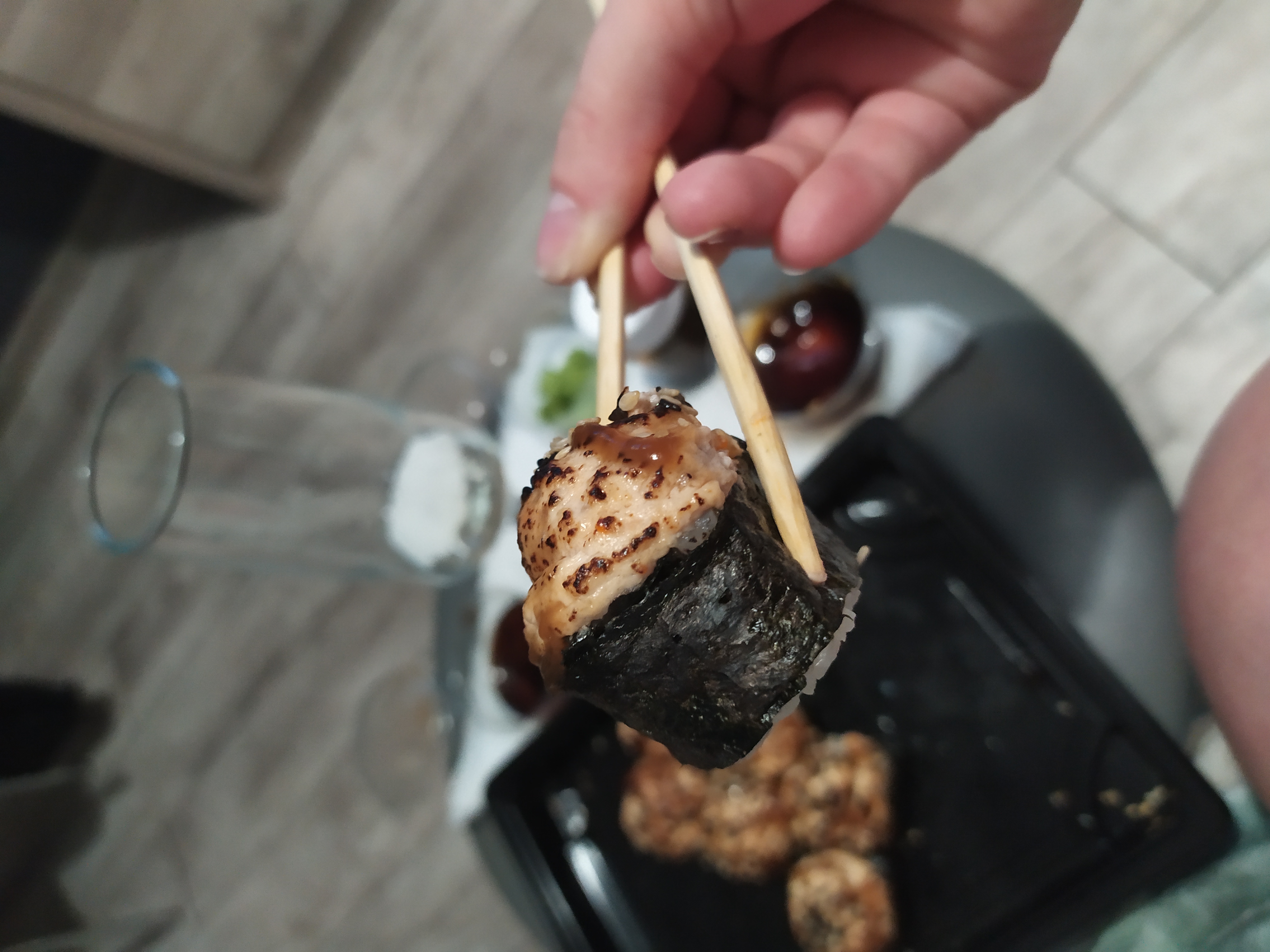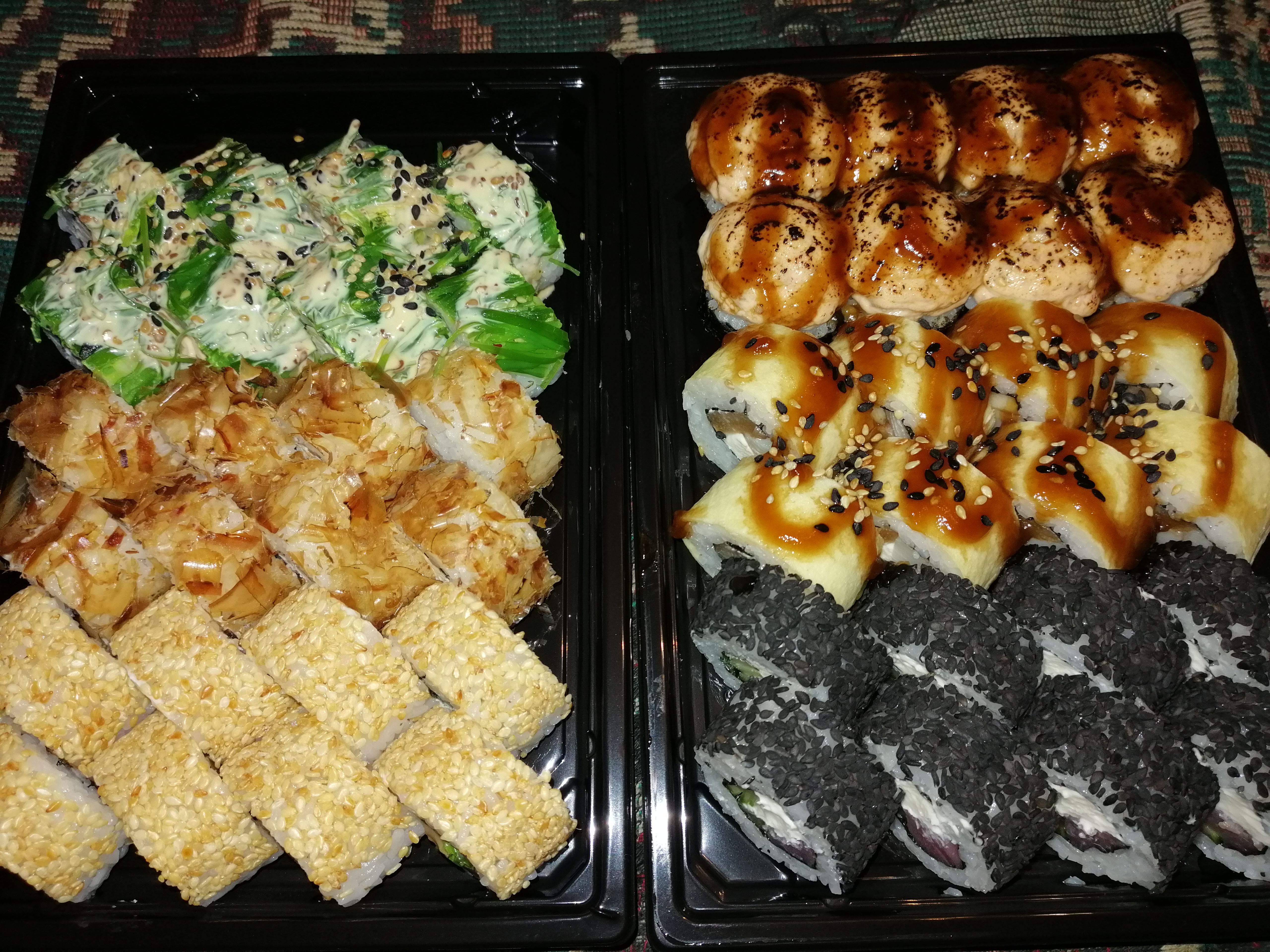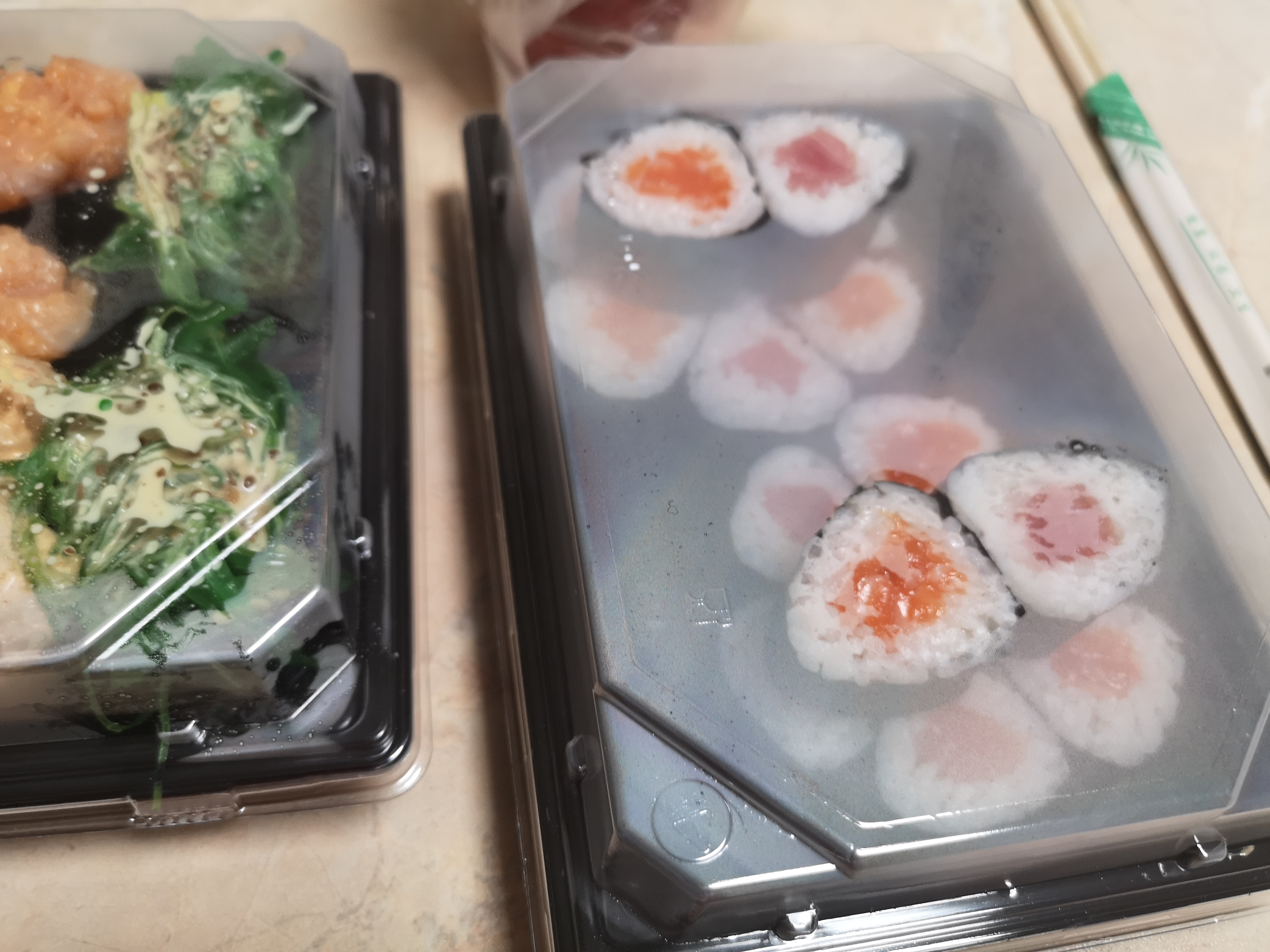 Всем доброго времени суток! Заказывали 03.01.20г. сет "2020" и по акции 2 по цене 1го роллы с опаленным лососем на самовывоз. Т. к. мы большие поклонники суши и являемся постоянными клиентами у другой компании, но вот решили попробовать что-то новенькое, (захотелось разнообразия в плане меню) . Делали заказ в данной компании впервые и полагались на преимущественное количество положительных отзывов. Приготовили очень быстро в течении 35 минут.Забрали мы их примерно через час.Персонал очень вежливый и внимательный. Суши свежие, имели презентабельный внешний вид, были скручены плотно и аккуратно .Количество рыбы скажем так было средненьким. Но МИНУС всё же был и это очень жёсткая ламинария. Она буквально не жевалась и была, как отдельный ингридиент, который изрядно испортил общее впечатление вкуса. Возможно просто нам так не повезло и действительно зависит от смены повара,но безусловно есть куда ещё расти данной компании.