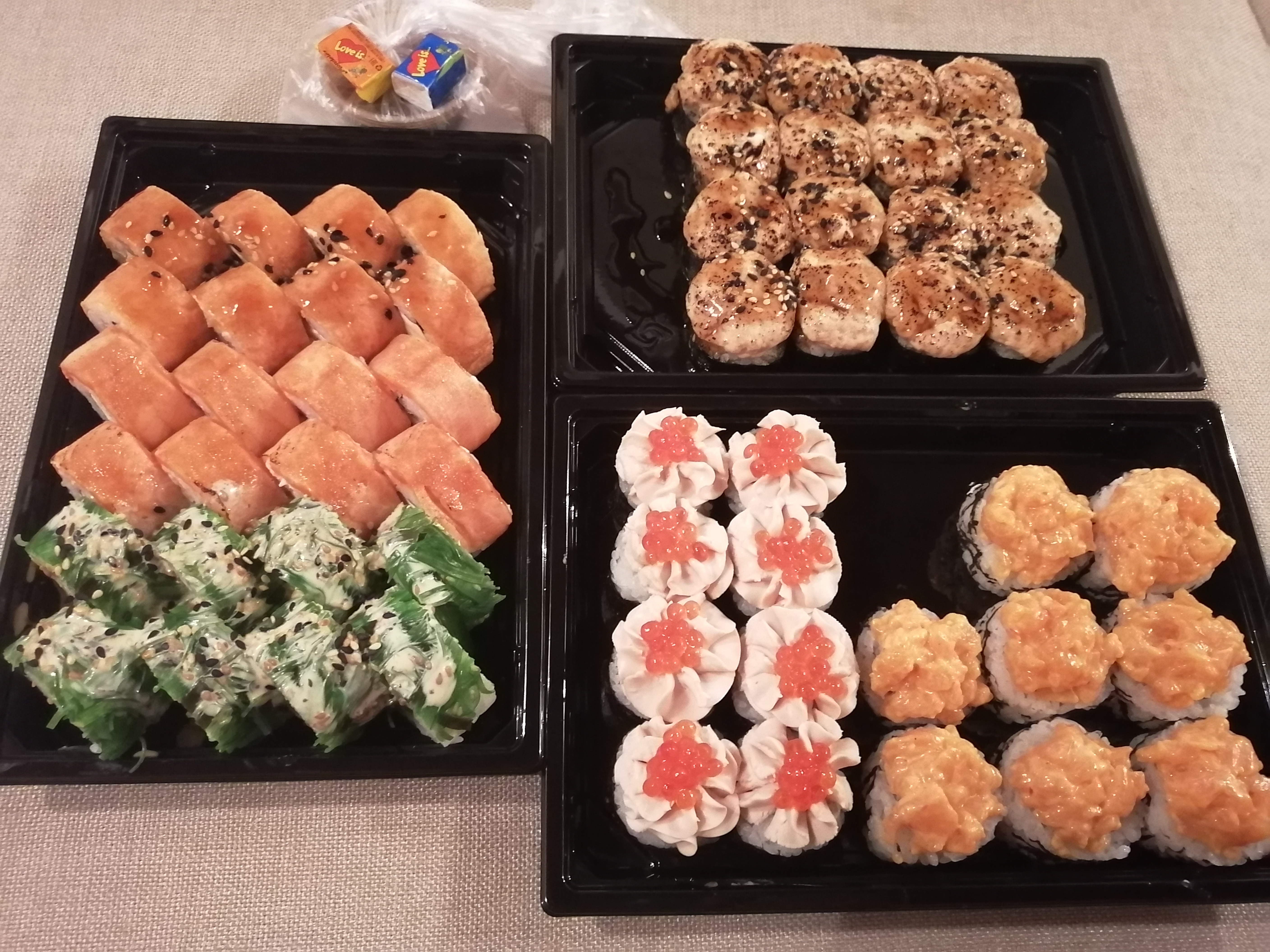 Всем доброго времени суток! Заказывали 31.01.новинку сет Малибу и роллы с опаленным лососем 2 по цене 1-го на самовывоз.В этот раз роллы оказались очень вкусными. Ламинария была не жёсткой,как в прошлый раз.Всё свеженькое и начинки  достаточное количество.Особенно порадовали гунканчики!👍Весьма удачный предложенный набор роллов в данном сете . Советуем попробовать! Как обычно в подарок шёл соус терияки и две жвачки  Love is. Благодарим за вкусный ужин.Судя по всему, всё же вы обрели постоянных клиентов в нашем лице! Всем всех благ!🤗