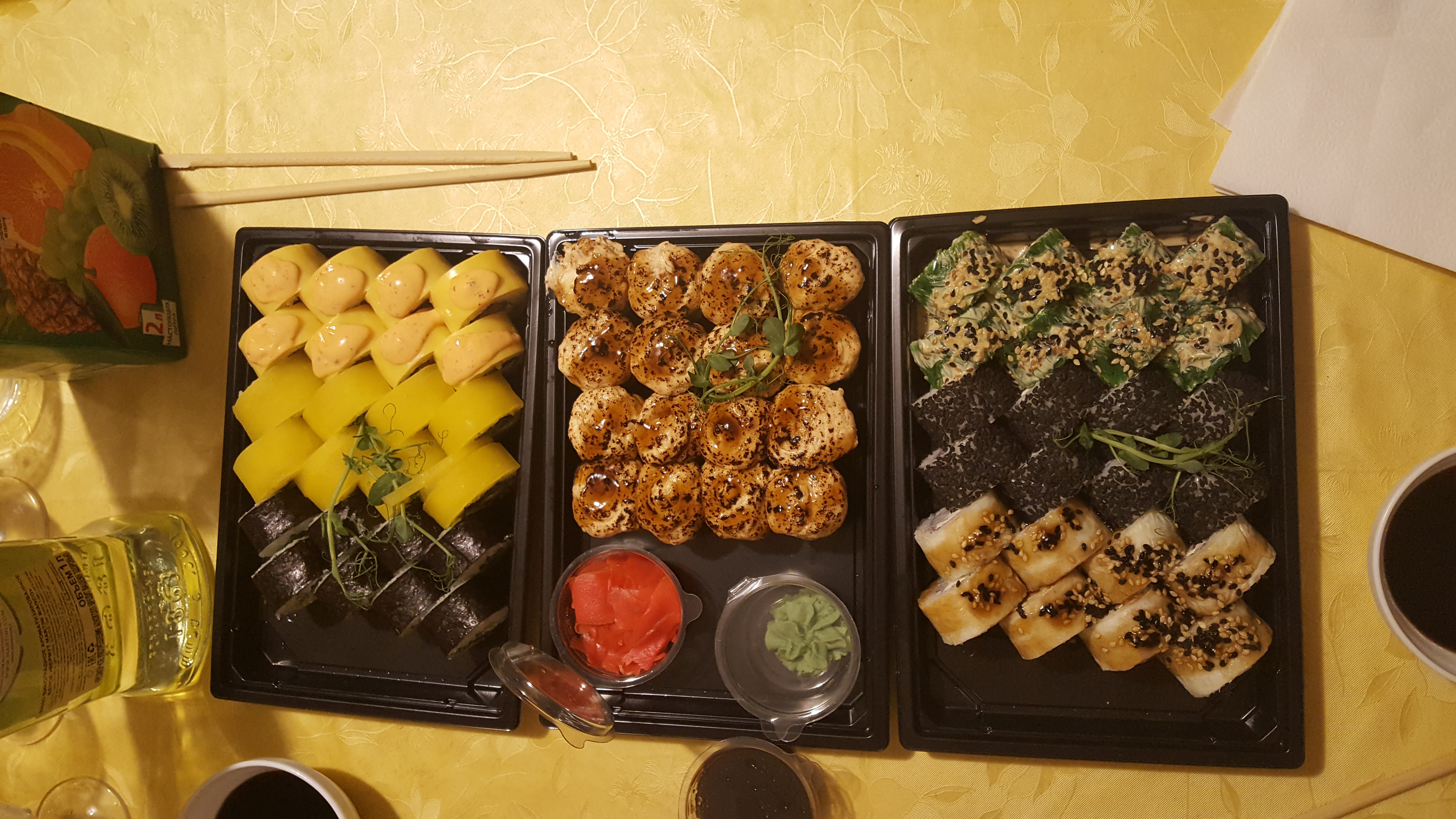 Заказали сет Аляска.,велеколепно!!!вкусно очень все свежее, заказали дополнительно кунжутный соус, положили бесплатно имбирь, васаби и соевый + две жвачки love, мелочь а приятно.,палочки тоже бесплатно!!! ЗАКАЗЫВАЙТЕ не пожалеете))