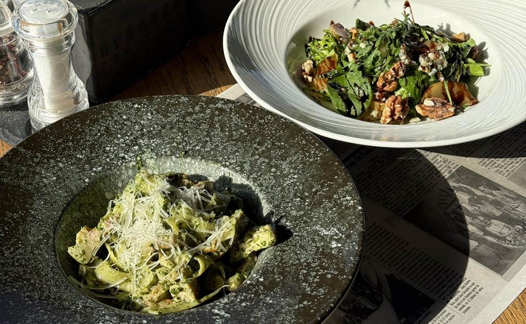 - cалат из карамелизированной груши, сыра дор-блю, листьев шпината, рукколы и салата лола-бьенда, грецкого ореха под медово-бальзамической заправкой (2 порции по 185 г)